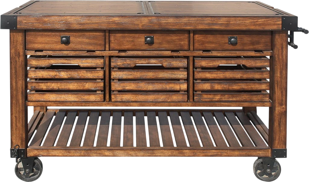 The Kaif kitchen cart with durable construction of wood and metal in a unique distress chestnut finish will become a stylish and function centerpiece of your home. The kitchen cart rests on casters, allowing you to move it easily. The storage space includes baskets, drawers and open shelf.Read More