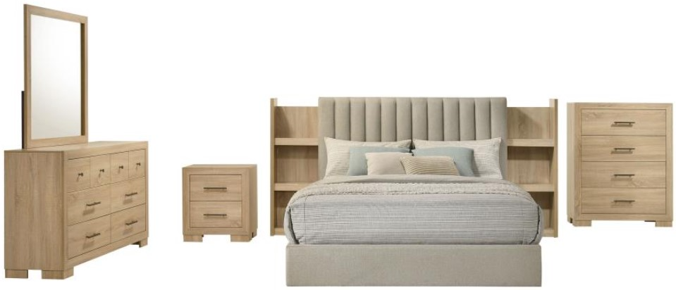 This bedroom set pairs quiet elegance with practical innovation. Finished in soft light oak, each piece features clean lines, antique nickel hardware, and thoughtful proportions. The bed includes a plush channel-tufted headboard framed by bookcase panels, each with three open shelves that glide outward on hidden casters.Read More