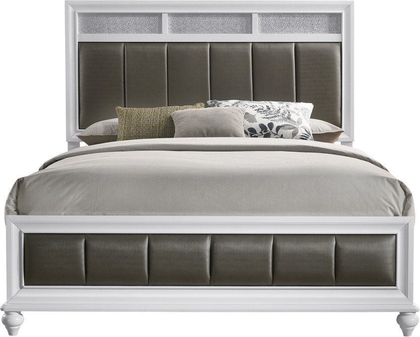 Perfectly suited for more transitional bedrooms, this panel bed frame features a tall panel headboard and footboard. With a white finished frame throughout, this bed offers extra touches such as channel tufted paneling wrapped in a metallic leatherette upholstery and sparkling accents. The white frame also features molding accents a well as turned feet on the footboard. Place this bedframe in a master suite to lend a more glamorous vibe. This bedframe is available in several sizes as well.
