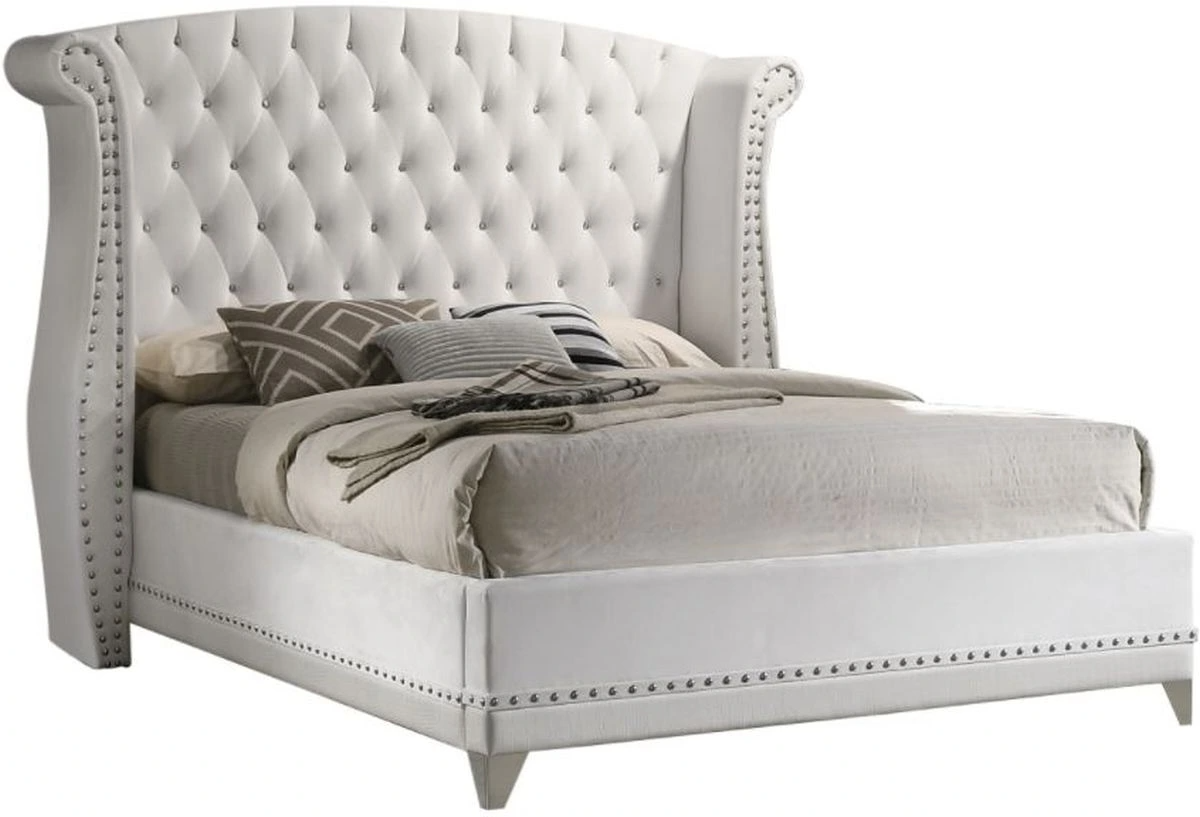 This majestic upholstered bed in soft white velvet, accented with crocodile textured white leatherette and individually hammered silver nailheads will add a touch of elegance to your sleeping environment