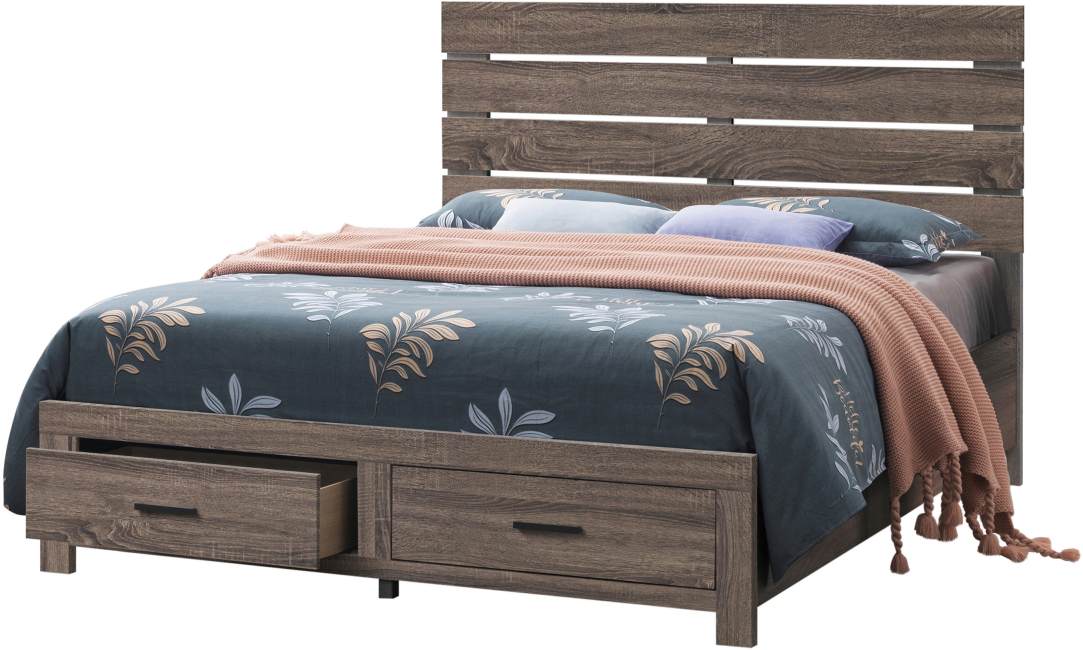 Elevate a bedroom with an exquisite focal point that exudes rich, country vibes. This handsome, rustic platform bed is classically crafted with bold, rustic appeal. A 3D paper veneer makes it easy to clean and maintain. Two footboard storage drawers offer convenient storage space. A plank-style headboard brings it all together with striking, old-world appeal.