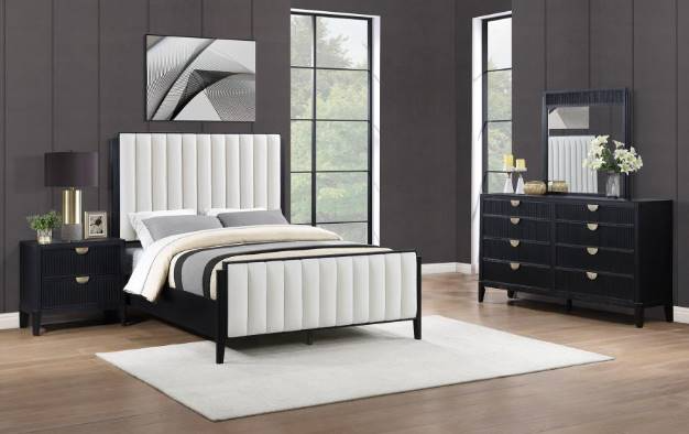 The Coaster® Brookmead 4-Piece Black/Ivory King Size Bedroom Set includes a queen upholstered bed, nightstand, dresser, and mirror. Featuring a black finish with gold accents and ivory tufted upholstery, this stylish set combines ample storage with elegant design for a sophisticated bedroom look.Read More