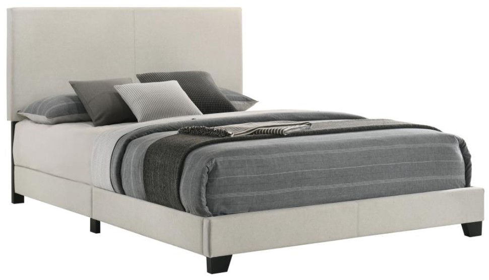 California king bed upholstered in cream fabric upholstery