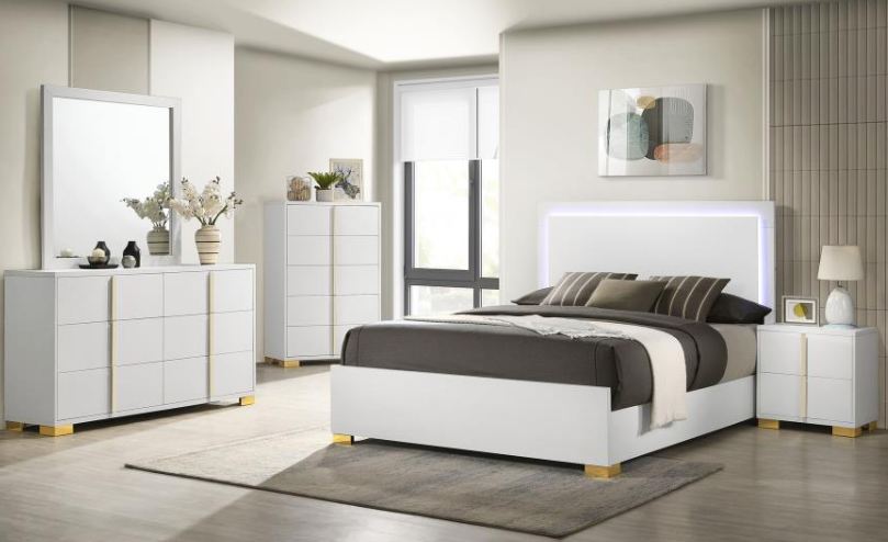 Cool white and warm gold create a compelling, modern ambiance for a stylish contemporary bedroom set. Centered on clean-lined silhouettes, the set features a modern bed complete with a squared headboard with built-in LED lighting that creates the right mood for relaxing evenings.Read More