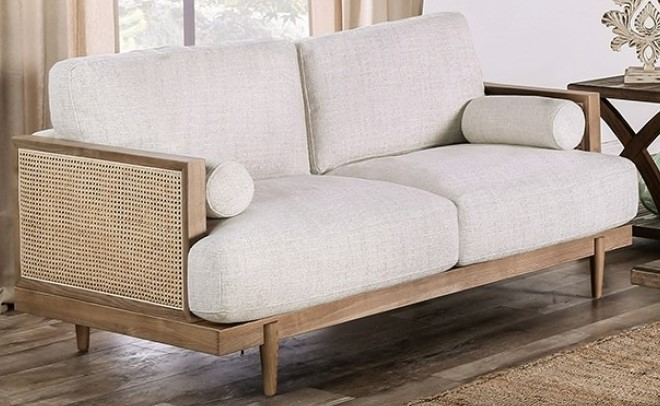 This sofa set harmoniously combines retro and mid-century modern aesthetics, enhancing any sophisticated home decor. Plush seat cushions and loose back pillows soften the straight lines and blocky construction. Natural elements like ash wood trims and woven rattan panels add organic flair, complemented by beige fabric for warmth.Read More