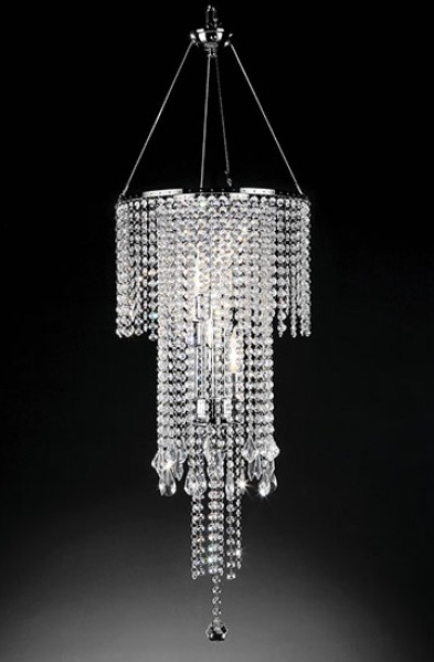 Hundreds of crystal droplets cascade off this chandelier and taper into a single shaped glass jewel.