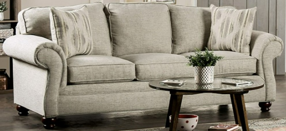 With its conservative looks and transitional flair, this sofa is for those who decided to go for a neutral palette in their home. The soft linen-like fabric in cream recedes to the background while small details such as the rolled arms, welt trim, and turned bun legs take center stage.Read More