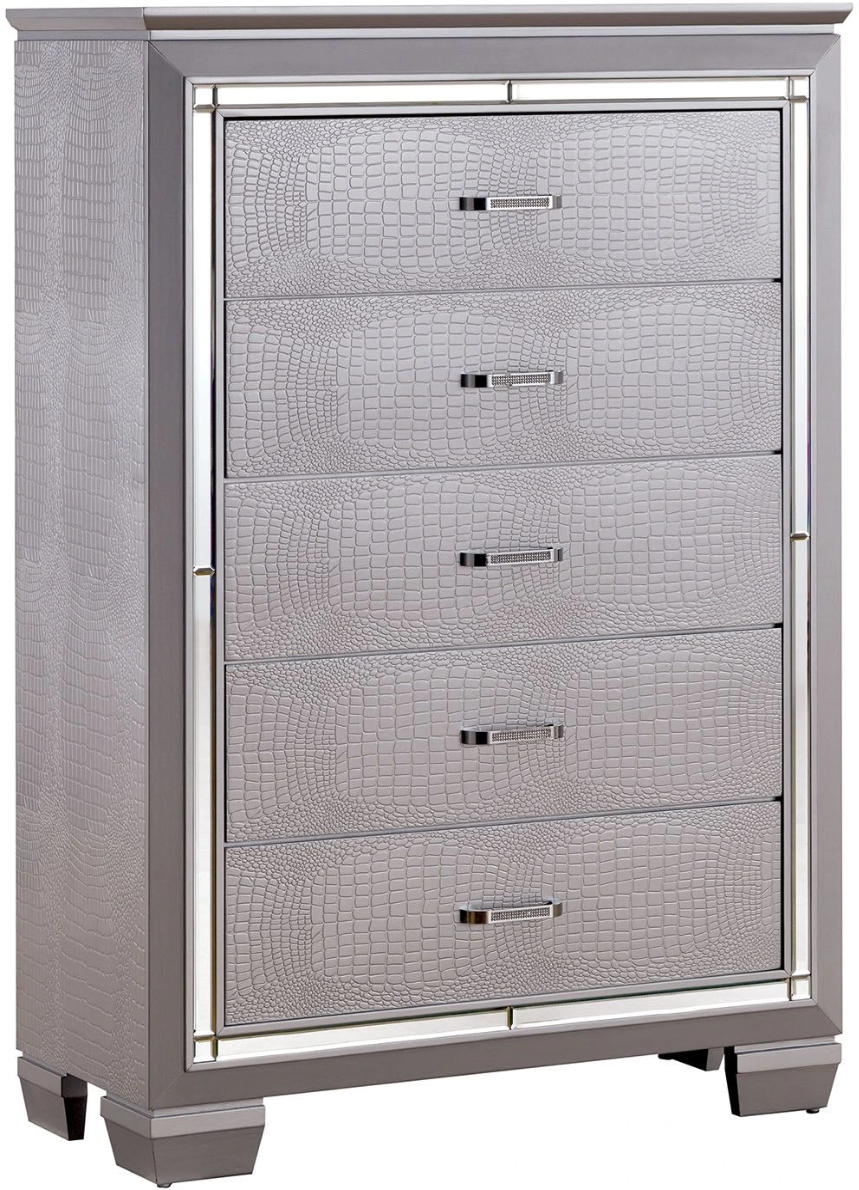 Bellanova Chest with felt-lined top drawers and solid wood veneer. Crocodile embossed veneer and silver lining panels stand out throughout every piece, including this matching chest.
