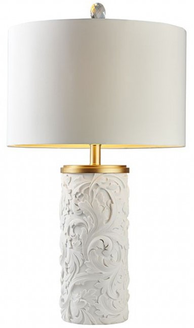 Intricately carved textures and patterns adorn the snow white porcelain-like base of this exquisite table lamp. Golden trim and accents offer a dynamic that is tastefully offset by the classic white lampshade.