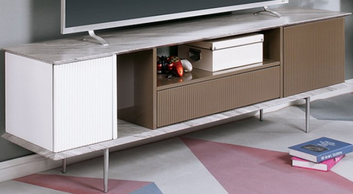This modern, multi-tone media console holds a large TV and boasts a drawer and multiple open shelves for convenient storage. The top and bottom panel comes in a beautiful pattern and made of paper veneer, while the middle frames are finished in high gloss white and champagne.Read More