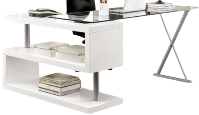 Designed with the contemporary worker in mind, this office desk will liven up any dull work space! A spacious 10mm glass table top and glossy, lacquer coated geometric table base work together to liven up any existing work space. Open shelves are available for storage as well. Finally, swing the glass top and chrome leg around for a more compact setting.Read More