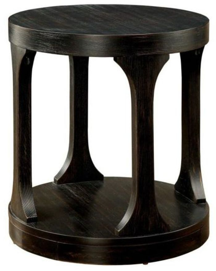 A thick, bold structure for a handsomely crafted end table. I-shaped legs connect the table top and round shelf base together to form a strong and daring accent piece. Its lower shelf offers extra storage space to organize your living room or display home decor elegantly whilst its antique black finish warms up your home!