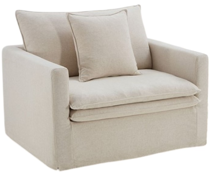Materials: Linen, feather blend, foam, solid wood and engineered wood