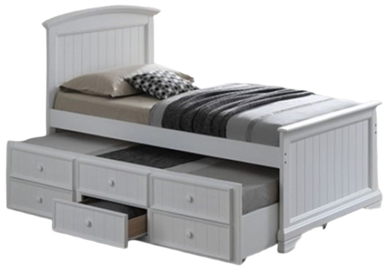 The Furniture of America® Fanton White Twin Captain Bunk Bed features a sturdy, space-saving design with built-in storage drawers underneath. Ideal for maximizing room space, it offers a safe and practical sleeping solution for children. The durable construction ensures longevity, while the neutral white finish complements various room themes.Read More