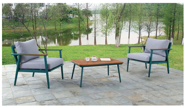 Take in the sun outdoors with this modern, colorful ensemble consisting of two chairs and a coffee table. With frames made of aluminum and armrests made of eucalyptus wood, it's a thoughtful combination of different materials for maximum durability.Read More