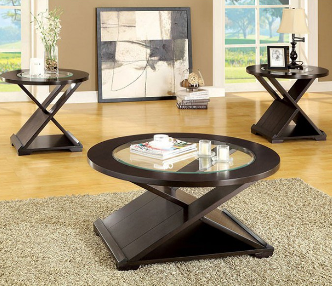 These matching occasional tables add contemporary style to any living area. Each with a glass round table top and unique base.