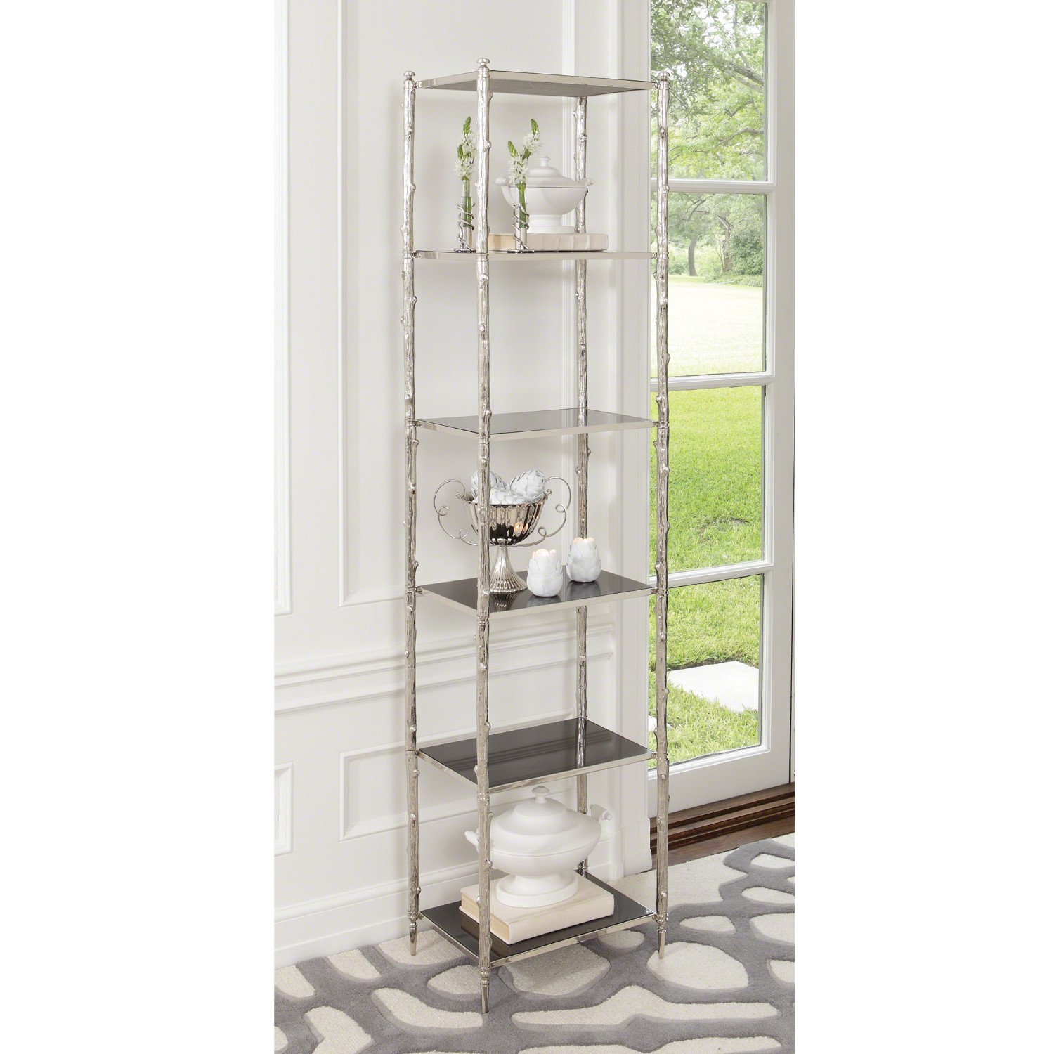 Referencing the natural world, this beautiful etagere has a twig textured nickel frame with six stationary, black granite shelves. The simple beauty of the materials shines through in this timeless design.Read More