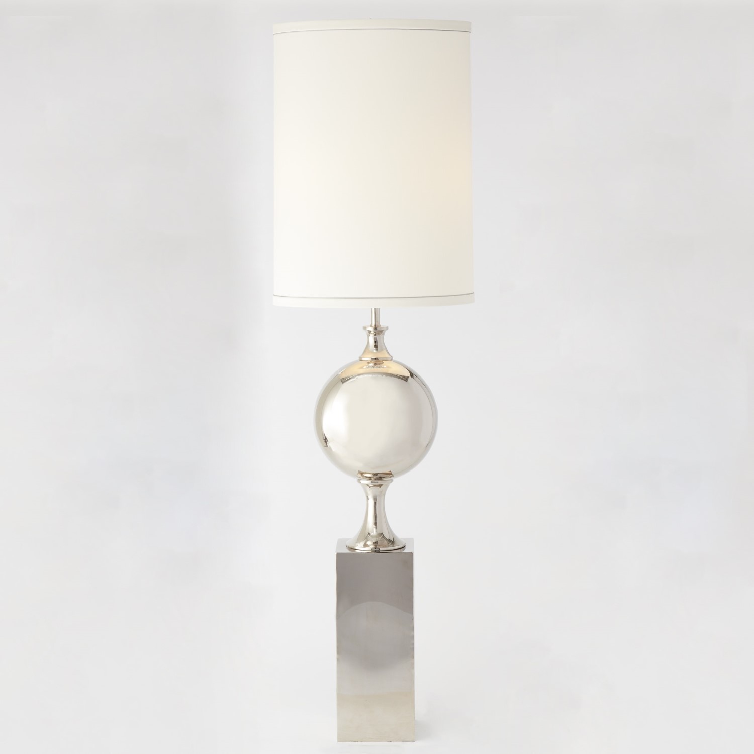 Made of stainless steel and brass with a polished nickel finish. Hardback shade covered in ivory silk with 1 inch flat folded edge. The dramatic shade is overall shaped and 30 inch.Read More
