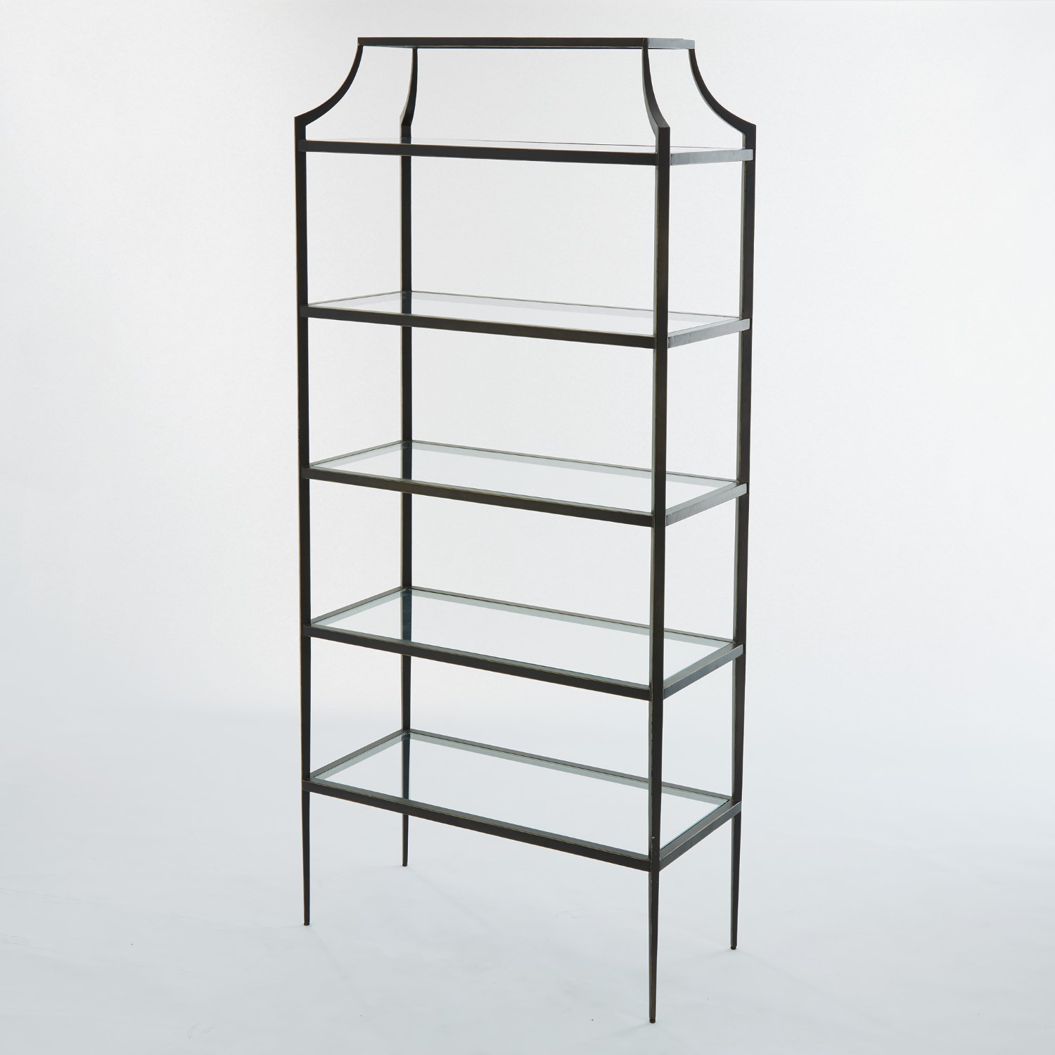 Lescot etagere has a Mansard inspired top detail made of bronze finished metal with tempered glass shelves and adjustable feet.Read More