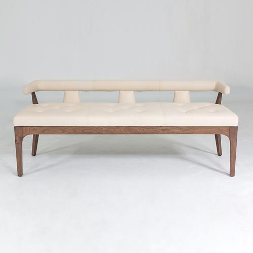 Inspired by classic modern design, updated with sleek lines and soft curves. This stylish bench has a low back and a wide comfortable ivory leather tufted cushions. The solid walnut frame adds durability to this already richly-designed piece. Available in black leather.Read More