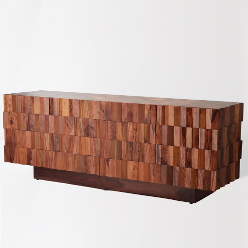 The Washboard Media Cabinet has magnetic door closures, two removable shelves behind each door and slat back design allowing for easy access to component wiring. The cabinet and Sunray cocktail Table are made of solid teak and sheesham wood with hand fitted marquetry.Read More