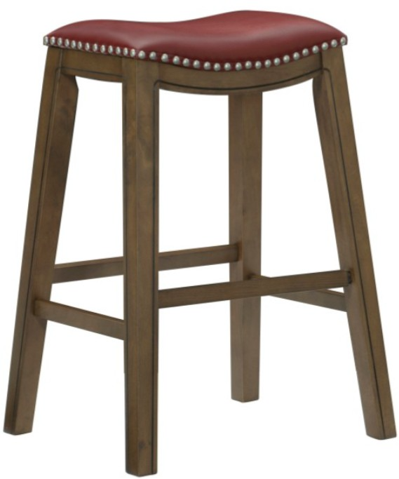 The stool is offered in three heights - 29-inches, 24-inches and 18-inches. The brown finished wood legs and seat apron feature routed accent while the red faux leather seat features nailhead trim that further defines the stool’s profile. 4 additional seat colors are available – brown, green, black and gray – in each stool height.