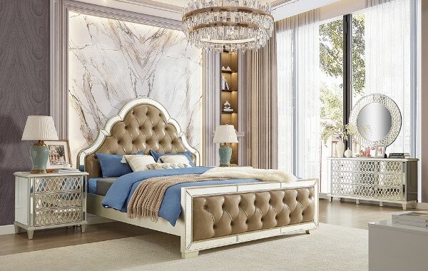 5pc Set Includes: 1 Bed, 2 Nightstands, 1 Dresser, 1 Mirror.
