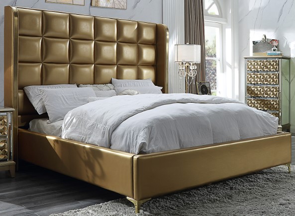 Complete your bedroom idea with this bed from Homey Design. Shown in an Antiqued Gold finish, this bed features a wooden frame and leather upholstery. This piece will definitely add style to your bedroom.Read More