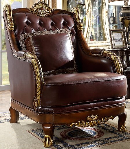 Accent your living area with this Chair. Its brown upholstery and mahogany and metallic bright gold finish on the frame give this chair an alluring appeal. With its beautiful design, this chair is sure to make a statement in your living room.Read More