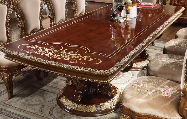 Dine-in style with this Dining Table. This wooden dining table features a burl and metallic antique gold on the tabletop and base. Make a bold statement by incorporating this furniture into your home.Read More