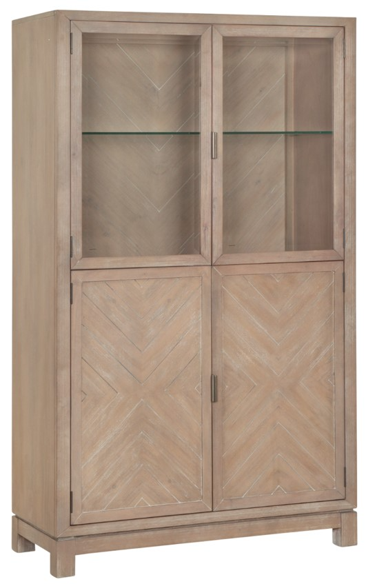 The Magnussen Home® Ainsley cerused khaki display cabinet blends rustic elegance with industrial charm. Featuring glass doors, LED touch lighting, adjustable glass shelves, and lower concealed storage with a felt-lined drawer, it’s crafted from acacia veneers and accented with bronze hardware—perfect for showcasing and storing your most treasured items.Read More