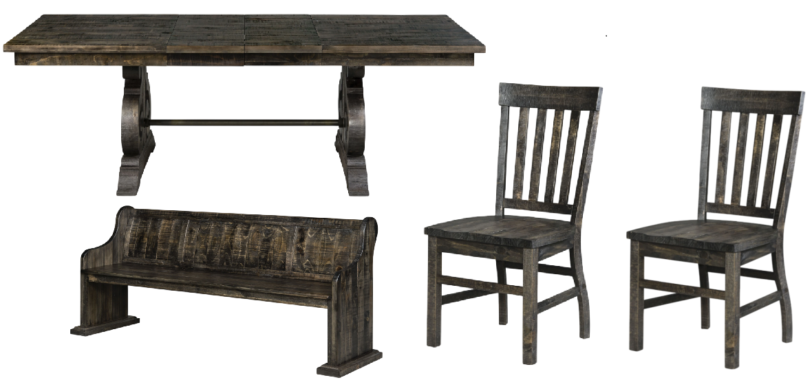 Set includes dining table, bench and 2 side chairs