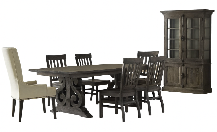 Perfectly proportioned to accommodate sprawling school crafts, fits of amateur bread baking or the usual holiday assemblage, our classically inspired Bellamy group maintains its pristine demeanor no matter what the task. Piled high with projects as it does all on its own, this group features pine solids and matte black with pewter highlights.