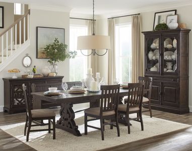 The trestle style extension dining table features ornately carved vertical column-like pedestals with a shaped Iron stretcher and expands from 80” to a total of 112” with two 16” center leaves.Read More