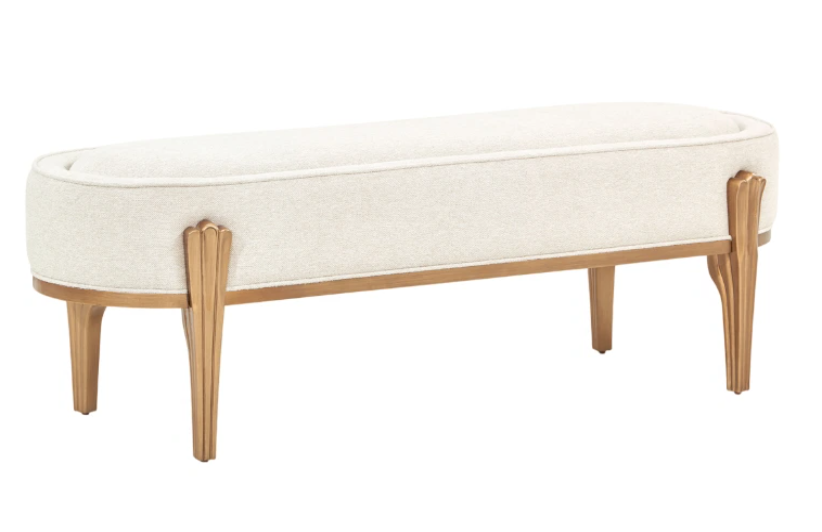 The Camellia Field warm pecan bench offering a functional accent for the foot of your bed or any space in need of additional seating. Upholstered in soft chenille with subtle channeling details, the bench exudes texture and craftsmanship. Its antique gold-finished legs, featuring sculptural details.Read More