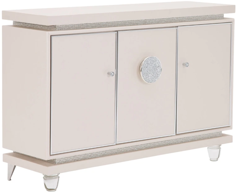 Band of crystallized facets wrap around the top and bottom of the sideboard