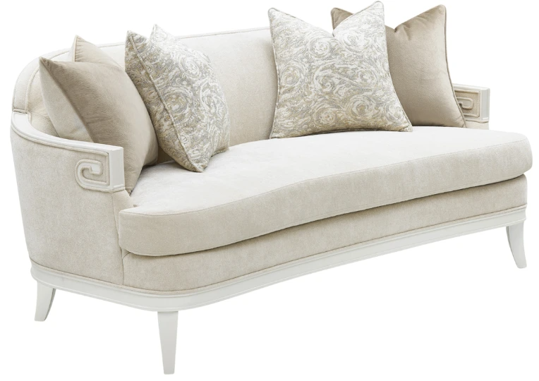 The La Marisia light champagne loveseat offers a delicate welting adds a tailored touch. The pearl-finished frame radiates understated luxury, accentuated by sculptural Greek Key-inspired scroll arms. Completing its opulent presence, four feather-filled accent pillows provide a mix of rich textures, creating a seating experience.Read More