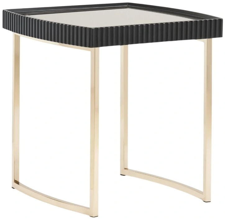 Complement your seating area with our elegant side table, featuring a silky matte black top adorned with stylish channel edging. The thin gold legs add a touch of refinement, while the mirrored inlay creates a captivating contrast.Read More