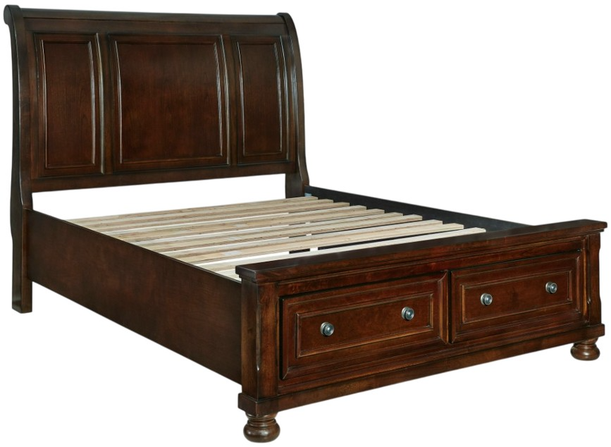 Includes sleigh headboard, sleigh rails and storage footboard