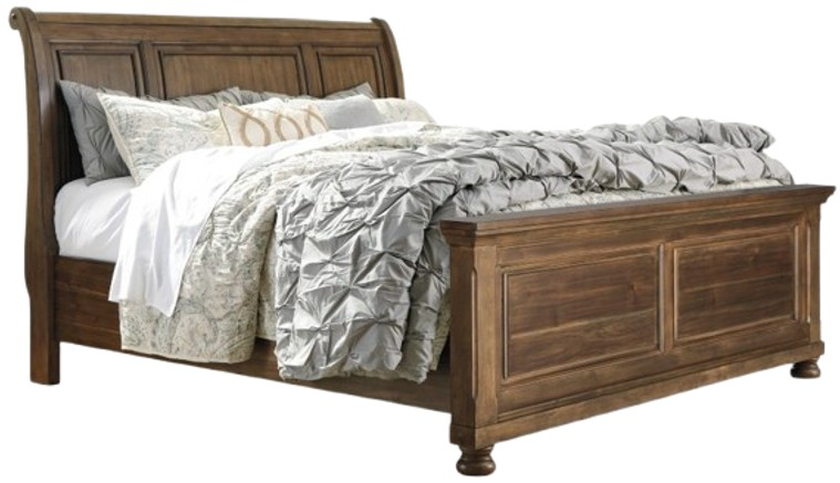A fresh, new take on traditional style. This queen sleigh bed meets today’s design tastes with beauty and grace. Tobacco brown finish allows the natural grain of the Acacia veneers to show through organically. Profiled crown moulding adds depth to the headboard and footboard.Read More